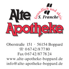 Sebapharma GmbH Boppard, Alte Apotheke Boppard, Brillen Becker, De Roy Therapie-& Gesundheitszentrum, Elektrohaus Carlheinz Brockamp, Haribo, Hellerwald GmbH, Höffling-Pies-Müller-Bollinger Steuerberater Boppard, Klostergut Jakobsberg, Kochhan Baustoffe, Kreissparkasse Rhein-Hunsrück, Lotto Stiftung Rheinland-Pfalz, REWE Markt Boppard - Familie May, Rhenser, Schottel GmbH, Architekturbüro Spitzley-Rechmann, Stadt Boppard, Stadthalle Boppard, Stammer Mode, Fahrschule Tiemann & Esser, Technik-Team Kant-Gymnasium Boppard, Tourist-Information Boppard, TUI Reisecenter Waldforst, Volksbank Rhein-Nahe-Hunsrück, Getränkemarkt Epona - Weinand, X-Sport Kastelllaun